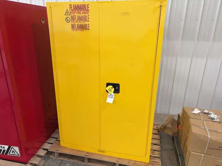 LOT 399 - Justrite Yellow Flammable Liquid Storage Cabinet, Cabinet Measures 43” Wide x 34” Deep x 65” Tall, (2) Adjustable Shelves, Auto Closing Doors,
